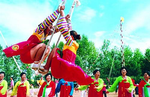 蕩秋千:也叫“打秋千”,是朝鮮族傳統(tǒng)體育項目,多在元宵、端午和中秋節(jié)舉行。尤其受到婦女們的喜愛,并經常進行該項目的比賽。比賽時評定優(yōu)勝者有幾種方法:一種是以秋千架前方高樹上的樹葉或花朵為目標,用腳碰著或咬掉樹葉(花朵)者為勝;一種是在踏板底下掛一根長繩,測量秋千蕩起的高度,高者為勝;還有一種是在秋千架前方豎兩根樹桿,桿上橫拉一根系有鈴鐺的繩子,蕩秋千者以碰鈴次數(shù)多少決定勝負。