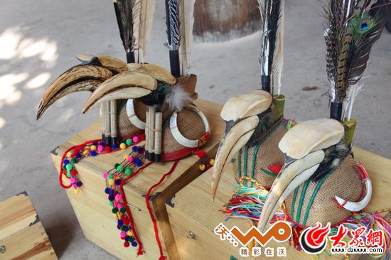 目瑙縱歌的領隊戴的頭飾,左邊是”瑙雙“戴的,右邊是”瑙巴“戴的。上面的犀鳥嘴和野豬牙都是從緬甸那邊弄來的。(施哲瑩攝)