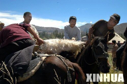 在新疆阿合奇縣草原上,柯?tīng)柨俗巫迥撩裨诒硌輦鹘y(tǒng)叼羊