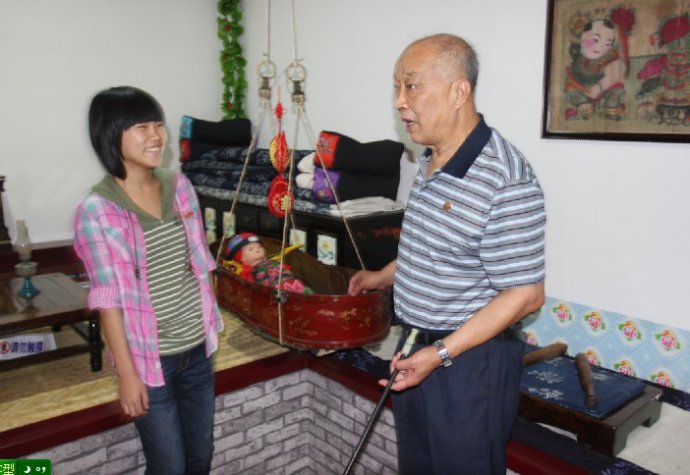 2011年6月26日,趙朝勛老人向“走進56個民族”回訪記者團的小記者施哲瑩介紹滿族傳統民族中的“口袋房、萬字炕、煙囪壘在地面上”。