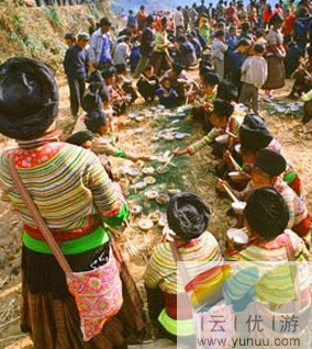 結婚這一天,新娘在娘家打扮妥當,由伴娘給她裹上頭帕,裹法和平時包頭帕不一樣,新娘的頭帕很大,包得如車輪一般。傈僳族的陪嫁物極簡單,數件頭帕、一件衣物和一床被蓋而已。頭帕是娘家親戚送的,娘家的兄、舅送的頭帕新娘就必須包起,于是新娘頭上的頭帕一般都是四五件土布,每件一丈二或一丈五,包時在最外層將布垂下,構成嚴嚴實實的蓋頭。現在的新娘好多了,包得并不是很多;而以前,有的新娘要裹上十件布的頭帕,致使蓋頭碩大無比。新娘雖被箍得頭痛欲裂,也只好默默忍受。