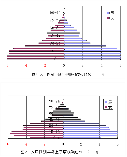 從各年齡段的人口比例看,少年兒童人口(0-14歲)比重為31.09%,勞動年齡人口(15-64歲)比重為64.14%,老年人口(65歲及以上)占4.77%,與1990年相比,少年兒童人口比重下降了7.83個百分點(diǎn),勞動年齡人口比重和老年人口比重分別增加了6.93和0.90個百分點(diǎn)。1990年和2000年黎族人口的性別年齡結(jié)構(gòu)如圖1和圖2所示。