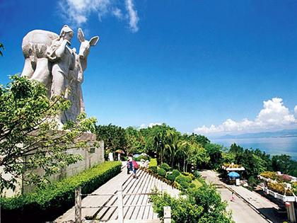 是海灘上的一座拔地而起的山嶺。在廣東海南島崖縣三亞港南5公里。這座山嶺從東北向西南伸延,然后折向西北,狀似一只金席站立海邊回頭觀望。這里有一段美麗的黎族民間傳說:古時候,五指山上住著一位勤勞勇敢、英俊善良的黎族青年,手拿弓箭追趕一只金鹿,金鹿奔逃來到海灘,面臨碧波萬傾的大海,走投無路,它猛一回頭,變成一位美麗的黎族姑娘,對著青年微笑。兩人遂給白頭之盟,在海邊安家立業(yè)。海灘上的嶺就是金鹿的化身。