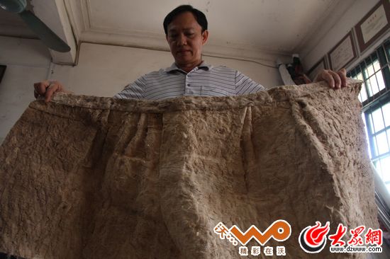 保亭縣文化館館長王呈給記者展示館里收藏的一件樹皮衣筒裙,樹皮衣由一種叫做見血封喉樹的樹皮制作而成,早期黎族人用此遮體避寒。