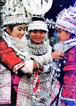 黔東南地區(qū)的苗族以各種銀飾為主要佩飾,這構(gòu)成了苗族身體佩飾的一大特色。在他們眼里,銀飾不僅可避邪的神物,更可給人帶來吉祥幸福。銀飾同時也財富的象征。所以,苗家少女全身上下的佩飾清一色都是銀飾,重的可達(dá) 8 - 10 公斤,其銀飾種類繁多,造型奇特,工藝精致,在中國各民族中是首屈一指的。