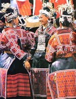 在繡衣上釘銀飾而制成的銀衣是苗族服飾中的精品。縐繡、散繡、堆繡是苗族特有的繡法。縐繡上衣花紋呈浮雕狀,裝飾效果強烈;散繡花紋十分精致漂亮;堆繡則指由各色三角綾子堆繡而成,裝飾效果奇特而美麗。用這三種繡飾方法制作的上衣均為盛裝禮服,稱作"花衣",盛裝花衣必須釘上許多銀飾才算最后完成,因此人們又將釘滿銀飾的花衣稱作"銀衣"。銀衣的前襟、后背、衣袖、下擺等位置釘綴許多四方形、長方形、半圓形的銀片和銀泡、銀鈴等鏨花銀飾。這種繡飾精美的銀衣可能是我國民族服飾中最為精美的。