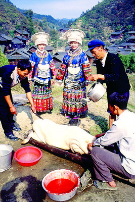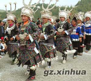 走寨結(jié)同年也是苗年期間重要的民俗活動。每到苗年。寨與寨之間便互為客主,互結(jié)同年。全村男女幾十人或上百人,帶上蘆笙,穿上節(jié)日盛裝,敲鑼打鼓到同年村進(jìn)行聯(lián)歡活動。進(jìn)村前以三曲笙歌告知主人,主人則帶領(lǐng)全村男女出村迎接。然后在蘆笙堂再次吹奏蘆笙及踩堂作為進(jìn)村儀式,主人也以吹蘆笙踩堂還禮。禮畢邀客人至各家款待。客人一般住三天,白天吹蘆笙踩堂,進(jìn)行蘆笙比賽,晚上演苗戲,未婚青年男女在此期間進(jìn)行“坐妹”對歌的社交活動,追尋自己的意中人,通宵達(dá)旦。