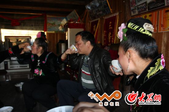 苗族飛歌之二:轉(zhuǎn)圈喝酒,先左轉(zhuǎn)一圈,再右轉(zhuǎn)一圈,同一個(gè)碗至少三個(gè)人喝過(guò),這樣表示”我們都是朋友,我們親密無(wú)間
