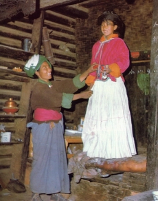 納西族的摩梭人成年禮又稱“穿裙禮”或“穿褲子禮”,俗稱“踩豬膘”。有人說:“沒有穿裙的少女,只是一棵含苞的花蕾;穿上了百褶裙的少女,就開始成一朵芳香四溢的花了。”這個傳統(tǒng)禮儀一般在大年初一為家中滿十三歲的孩子舉行。儀式在母系大家庭中進行。屋中火塘下面建有兩根柱子,右邊為女柱,女孩子的穿裙禮在女柱下進行;左邊為男柱,男孩的穿褲子禮在男柱下進行。儀式開始前,成丁者的衣服分別掛在男女柱上,達巴(祭司)則在一旁念經(jīng)。成丁的孩子先給狗喂食以示謝恩。因為神話講到人與狗換了壽命,才可活一百歲。孩子身體被洗凈后,裸身站在柱子下,雙腳分別踏在豬膘和糧袋上。女孩右手拿帽子、項鏈、耳環(huán)等;男孩右手拿長刀,左手握銀元、布匹之類。女孩穿裙儀式由母親或?qū)傧喾系呐藖聿僮鳎泻⒋┭澴觾x式由舅父來完成。穿著完備后,親友長輩向孩子送禮,成丁孩子分別向祖先牌位、鍋莊神、灶神和父母長輩叩頭致謝,然后靜聽達巴念誦祖譜,并跟唱祝福歌。儀式結(jié)束后,青年男女通宵達旦舉行舞會。