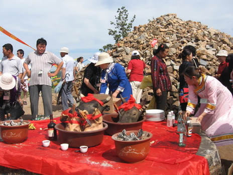 在這個達斡爾族一年一度最為隆重的民族節日里,人們清晨來到祭壇周圍,就地取一塊石頭,擺放到祭壇旁邊,如有因故不能前往者,可由家人或親朋好友代放。早先,這是一種報到方式,屬于族內清點人數的舉動。斡包選定在水草肥美、林木茂盛的高地上,它堆得越高越大,預示著民族的緊密團結和興旺發達。在斡包的中部頂端,插有松樹或柳樹枝,枝條上系有代表各部落的彩色布帶。斡包西邊的祭壇上,則擺放宰殺的牛羊頭、各種食物和倒滿的三杯酒。