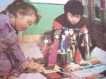 達(dá)斡爾族女孩玩“過家家”,用紙做房子,房子里面用紙做炕,樺樹皮做的小搖車,最有趣的是“哈尼卡”——紙做的玩具娃娃。大個(gè)的當(dāng)長(zhǎng)輩,小的當(dāng)子孫。孩子們一邊擺放著紙做的娃娃,一邊講著假設(shè)的生活情景。“過家家”不但增長(zhǎng)孩子的生活知識(shí),而且培養(yǎng)她們的想象能力和表達(dá)能力,是一種對(duì)兒童十分有益的民間游戲。