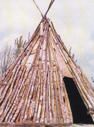 鄂倫春人的傳統住宅是“斜仁柱”!靶比酥笔嵌鮽惔赫Z,意為“木桿屋子”。是一種用二三十根五六米長的木桿和獸皮或樺樹皮搭蓋而成的很簡陋的圓錐形房屋。夏天用樺皮或蘆葦,冬天用狍皮做覆蓋物,搭蓋一個"斜仁柱"需要六七十張狍皮。門上夏天掛柳條穿的門簾,冬天掛狍皮或鹿皮門簾。