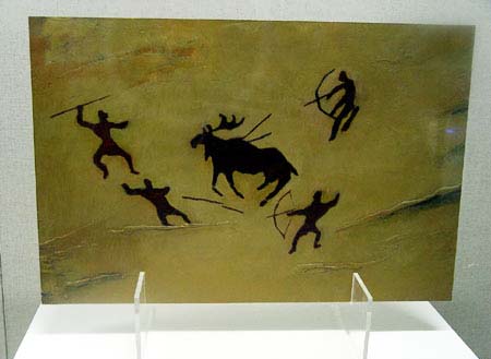 馴鹿巖畫(huà)用赭石料描繪,色調(diào)分明,結(jié)構(gòu)比較簡(jiǎn)單,有完整的馴鹿輪廓。此外,還有一幅表現(xiàn)一群獵人圍獵一頭駝鹿場(chǎng)面的巖面,具有濃厚的原始集體狩獵時(shí)代的氣息。