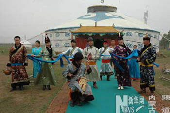 內(nèi)蒙古正藍旗一家牧民開辦的旅游點上,身著盛裝的蒙古族姑娘、小伙子手捧哈達、美酒迎接遠方的客人。(布和朝魯 攝)