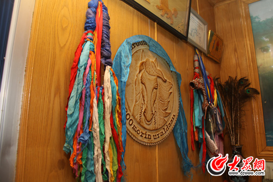 墻上所掛的五彩絲帶就是江嘎,只有在三次一定級別的那達慕上獲得冠軍的人才有資格佩戴。