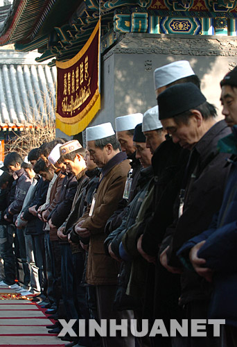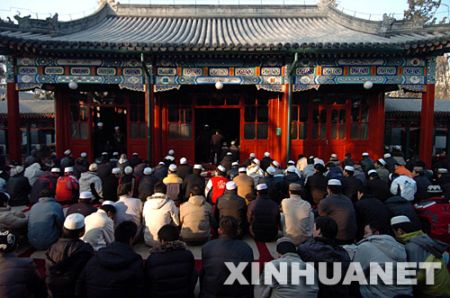 穆斯林群眾在北京牛街清真寺做禮拜。 新華社記者章磊攝