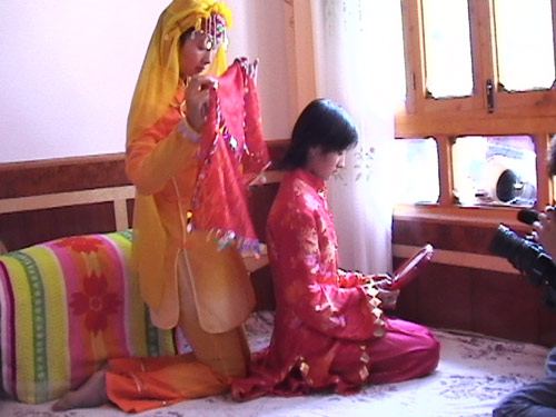 婚禮一般在黃昏舉行。儀式開始,先由女方的長輩在庭院里給新郎戴上新帽,系上繡花腰帶,再進上房,由已婚的至親陪伴,面對阿訇坐在炕上的木凳上。岳丈問新郎:“我女兒已許配給你了?”新郎點頭允認,然后阿訇起誦“尼卡亥”(證婚贊詞),把盤中的紅棗、核桃分撒給室內外的觀眾,婚姻算正式準認。