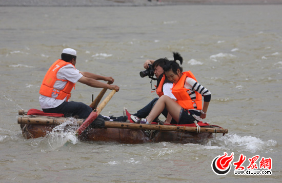 大眾網(wǎng)特約小記者施哲瑩和大眾網(wǎng)記者劉國棟乘坐羊皮筏子漂流黃河。