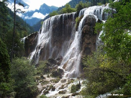 瀑布是水流形式中的佼佼者,大自然之一絕,九寨溝是水的世界。也是瀑布王國。這里幾乎所有的瀑布全都從密林里狂奔出來,就象一臺臺綠色織布機永不停息地織造著各種規格的白色絲綢。這里有寬度居全國之冠的諾日朗瀑布,它在高高的翠巖上急瀉傾掛,似巨幅品簾凌空飛落,雄渾壯麗。有的瀑布從山巖上騰越呼嘯,幾經跌宕,形成疊瀑,似一群銀龍竟躍,聲若滾雪,激濺起無數小水珠,化作迷茫的水霧。朝陽照射,常常出現奇麗的彩虹,使人賞心悅目,流連忘返。