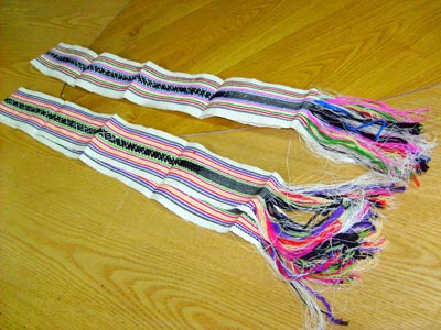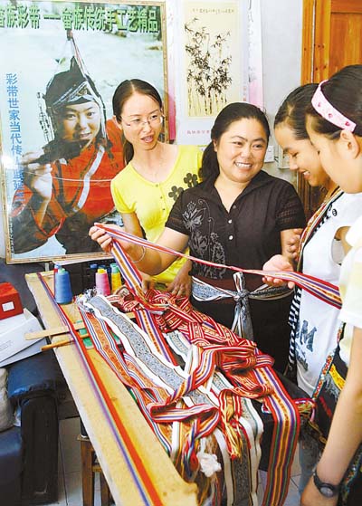 畬族姑娘長到六、七歲時,母親就教授她織彩帶。彩帶以絲線編織為主,也有用棉紗或苧麻編織的?棽蕩]有特制的織帶機,屋內屋外乃至山野都可編織。若在屋內編織,就把 絲線的一端拴在凳腳、桌檔或屋柱上,另一端系在自己的腰間,坐 在凳上編織。要是在山野編織,可把絲線的一端拴在小樹桿或樹樁上,另—端仍束在腰身,坐在地上或跪在地上編織。