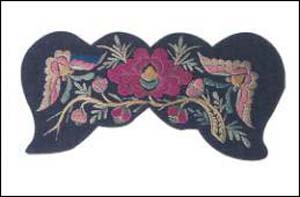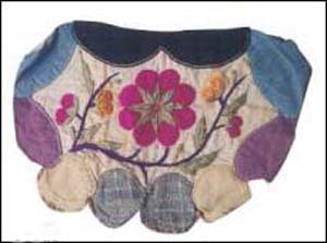畬族民間工藝中的另一朵奇葩,就是畬族民間刺繡。這是從古老的繡香袋發展而來的刺繡工藝。李調元《南越筆記》載:“女初嫁,垂一繡袋”。后來發展為繡帳額、枕面、圍腰、衣領、袖口、裙邊、鞋面、扇心、女子綁腿和圍涎、圍項、童帽、肚兜等生活衣著用品。