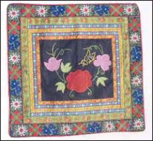 [提要] 畬族民間工藝中的另一朵奇葩,就是畬族民間刺繡。這是從古老的繡香袋發展而來的刺繡工藝。李調元《南越筆記》載:“女初嫁,垂一繡袋”。后來發展為繡帳額、枕面、圍腰、衣領、袖口、裙邊、鞋面、扇心、女子綁腿和圍涎、圍項、童帽、肚兜等生活衣著用品。