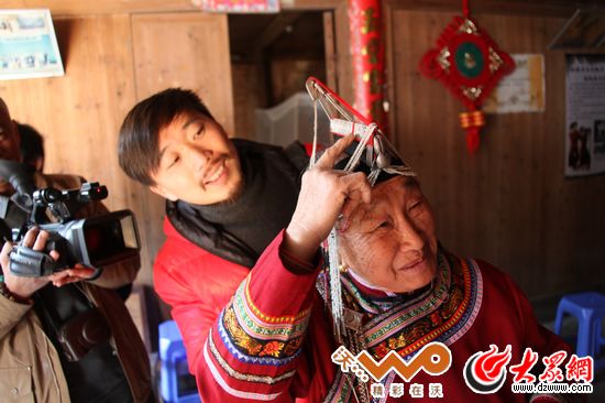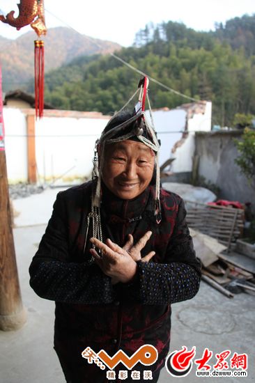 因為聽說有記者來采訪,藍大媽特意穿上了絳紅色鑲五彩花邊的畬族傳統服裝,腰系著彩帶,頭上則戴著畬族特有的銀飾鳳頭冠,愛笑的藍大媽整個人顯得特別精神,一點都看不出來這是一位年過七旬的老太太。