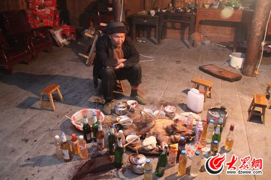 “鬼師”正在念水書,面前擺著祭拜鬼神的貢品