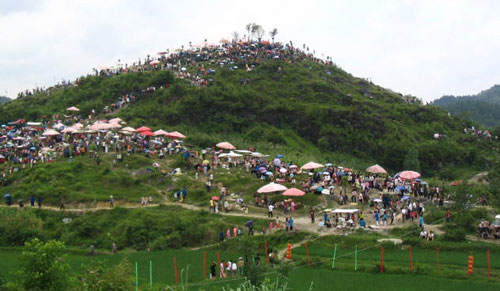 卯日是節(jié)日活動的高潮。新年初一的卯日盛行著趕卯坡青年男女唱對歌的習(xí)俗。卯坡是經(jīng)過多年遺俗選定下來的,專讓青年男女以唱對歌的形式進行廣泛社交活動的場所。一般多選在一個依山傍水地勢較寬,能容納下數(shù)萬人平坦的坡頂上去進行。屆時,不僅過卯節(jié)的村寨青年人要上卯坡對歌,就是不過卯節(jié)的外寨和毗鄰各縣的男女老幼也會趕來參加盛會。有些經(jīng)商者也要來擺攤設(shè)點,出售各種食品和日用雜貨,頓時會使得整個卯坡人聲鼎沸,熱鬧非凡。開始對歌前,先由一德高望重的老人當(dāng)眾宣布對歌場上的戒律:只準(zhǔn)未婚青年男女方可參加對歌。并預(yù)祝對歌的后生們能在對歌聲中尋到自己的意中人。于是,在一片吆喝嬉笑聲中,青年男女三五成群各自尋找自己唱對歌的對手,在卯坡的樹叢中、草地上、山石旁,或站或坐地?fù)纹鸶魃▊阏谧∧槼饘Ω鑱怼?/P>
