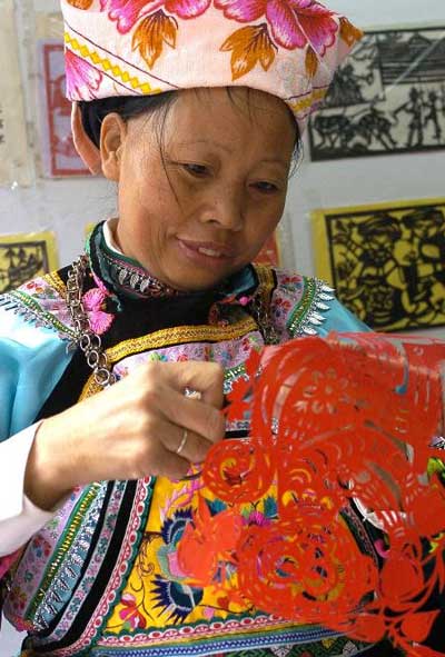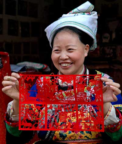 在自己剪紙致富的同時,韋幫粉沒有忘記家鄉(xiāng)的同胞姐妹。除毫無保留地傳授技術(shù)外,還為當(dāng)?shù)氐乃逦幕a(chǎn)品——水族服飾、水族銀飾等找銷路,如今在她的影響和帶動下,依靠剪紙或經(jīng)商走上致富路的同村婦女不下20人。