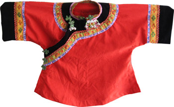 水族女服多以水家布縫制,無領(lǐng)大襟半長衫或長衫。長衫過膝,一般不繡花邊。而節(jié)日和婚嫁盛裝與平時(shí)截然不同。婚禮服上裝的肩部一圈及袖口,褲子膝彎處皆鑲有刺繡花帶,包頭巾上也有色彩繽紛的圖案。頭戴銀冠,頸戴銀項(xiàng)圈,腕戴銀手鐲,胸佩銀雅領(lǐng),耳垂銀耳環(huán),腳穿繡花鞋。新娘子往往被打扮的花枝招展,風(fēng)采翩翩。此外婦女刺繡的背帶更有藝術(shù)性。說是"帶",實(shí)際上是一塊刺繡華麗的"T "形"簾子",上端兩邊有帶,"簾子"的大小可包住幼兒。它是將白色馬尾纏繞上白絲線,再加上其它彩色絲線,先把各種圖案分別刺繡好,最后將繡好的圖案拼鑲到背帶布料上做成的。背帶美觀實(shí)用,是母親對出嫁女兒最好的禮品。