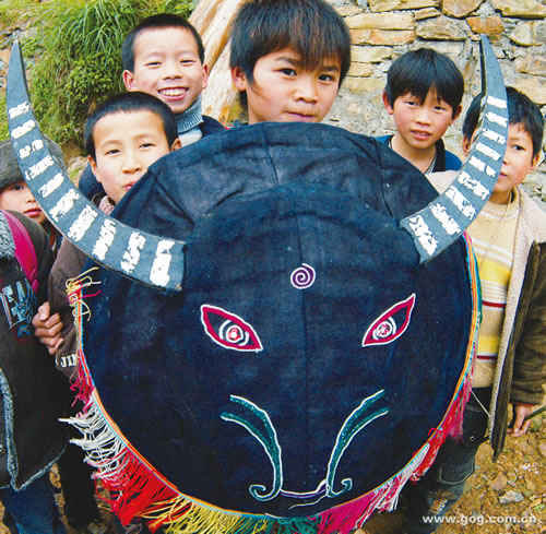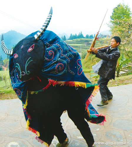 自己縫制的牛角是斗角舞最關鍵的道具。頭頂牛角,穿上黑色的披風,伴著蘆笙節(jié)奏,邊舞邊斗,猶如水牛在田中玩鬧、打架,動作剛健英武。因此,這里的水族人形容這個舞蹈,一般都形象地說“打得精彩”。雖然這是祖輩傳下來的舞蹈,但也不是人人都能學的,按韋支書的說法:一要受得了累,二要懂點技巧。村里會“斗角”的也就40多人,但是“打得精彩”都是年輕人。如今,年輕人大都外出打工了,也只有過春節(jié)的時候寨子里斗得最熱鬧。