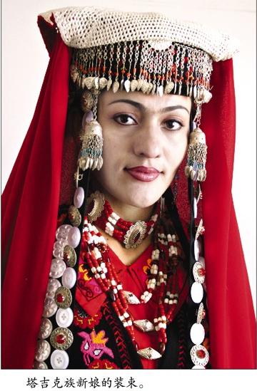 在塔吉克族的服飾中,最引人注目的要數(shù)新郎和新娘的裝束了。新娘除了戴“庫(kù)勒塔”帽外,還要在帽子前綴一排叫“斯力斯拉”的銀色小鏈子,帽子的前面和兩側(cè),還有銀質(zhì)的裝飾品,兩耳墜著長(zhǎng)長(zhǎng)的耳環(huán),頸部戴幾排碩大珠子的項(xiàng)鏈,把脖子圍得緊緊的,辮子上飾絲穗或白扣、銀元,手上還要戴手鐲或戒指。除此以外,頭上還要蒙一條長(zhǎng)長(zhǎng)的紅色或黃色的頭巾,腳穿“喬魯克”靴,外穿紅色的長(zhǎng)大衣,把掛有銀飾的辮子放在前面,兩只手的無(wú)名指上,戴上戒指,要系上紅白相間的手帕,這種打扮如同仙女一樣,十分動(dòng)人。婚后,這種新娘的裝束至少要保持一個(gè)月,所以在大街上看到穿這種新娘服飾的年輕婦女,就知道她們都還在蜜月中哩!