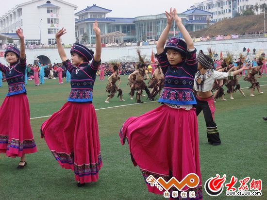 千余名大學生身著傳統土家族服飾,跳起了穩重粗獷、健美有力的土家擺手舞蹈