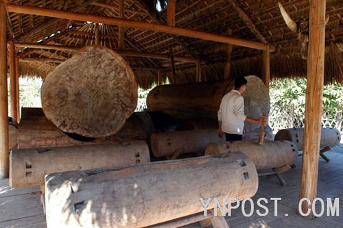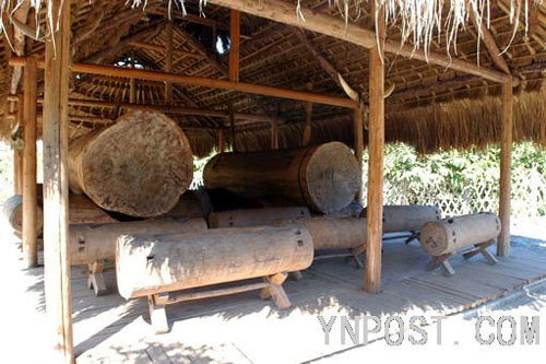 在西盟縣城旁邊,就有一座專門放置木鼓的博物館,附近村寨的木鼓都寄放在這里,待節(jié)日到來(lái)后,村里人專門舉行儀式將木鼓拉到慶典場(chǎng)地,敲響木鼓,盡情狂歡。在博物館里面的木鼓都是用整顆大樹雕刻形成,有大有小,總共約有近百個(gè),最大的直徑近二米。