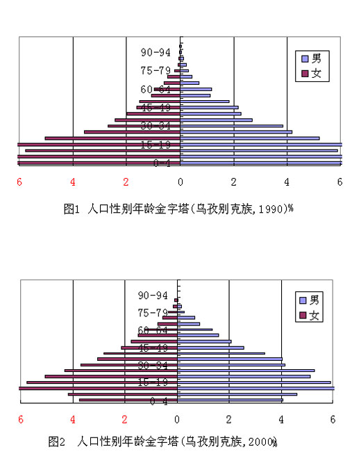 從各年齡段的人口比例看,少年兒童人口(0-14歲)比重為29.18%,勞動年齡人口(15-64歲)比重為66.86%,老年人口(65歲及以上)占3.96%,與1990年相比,少年兒童人口比重下降了9.07個百分點,勞動年齡人口比重和老年人口比重分別增加了8.47和0.60個百分點。1990年和2000年烏孜別克族人口的性別年齡結構如圖1和圖2所示。