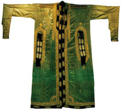烏孜別克族男子的傳統(tǒng)服裝是一種長(zhǎng)度過(guò)膝的長(zhǎng)衣,長(zhǎng)衣有兩種款式,一種為直領(lǐng)、開(kāi)襟、無(wú)衽,在門(mén)襟、領(lǐng)邊、袖口上繡有花邊。衣服上有花色圖案,十分美觀;另一種為斜領(lǐng)、右衽的長(zhǎng)衣,類(lèi)似維吾爾族的“裕袢”。腰束三角形的繡花腰帶,一般年輕人的腰帶色彩都很艷麗,所穿襯衣的領(lǐng)邊、袖口、前襟開(kāi)口處都繡著紅、綠、藍(lán)相間的彩色花邊圖案,老年人卻愛(ài)穿黑色長(zhǎng)衣,腰帶的顏色也偏于淡雅。烏孜別克族對(duì)長(zhǎng)衣的布料十分講究,過(guò)去多用“伯克賽木綢”(一種質(zhì)地厚軟的綢料)或金絲絨,現(xiàn)在也用各種質(zhì)地優(yōu)良的毛料。