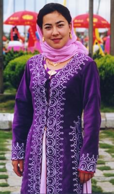 夏季,青年女子穿花團(tuán)錦簇的連衣裙。胸前往往精工繡上各式各樣的花紋和圖案,并綴上五彩珠和亮片。有時(shí),在連衣裙的外面加上繡花襯衫,西服上衣,下配各式花裙,秀雅不俗,別具風(fēng)采。相對(duì)而言,老年則喜歡寬大,褶多的衣裙,不過(guò)都是絲綢制成。烏孜別克婦女愛(ài)穿名叫“魁納克”的連衣裙,寬大多褶,不束腰帶,有的在連衣裙外再穿各種顏色坎肩,也有穿各式各樣短裝的。