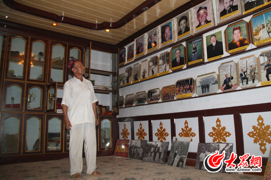 吐爾遜·司馬義老人站在自己的木卡姆博物館,仰望木卡姆前輩藝人的影像。