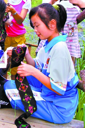 在學校學習到一定階段后,孩子們回到山村里,便會得意地和老一輩的瑤民們“切磋切磋”,常令大人們大吃一驚。如有一位女生便對瑤繡進行了現代化“改造”,突破了原有的瑤繡傳統圖案,靈活地繡出了她所喜歡的小豬小狗等卡通圖案,讓年邁的“繡娘”奶奶贊譽有加。