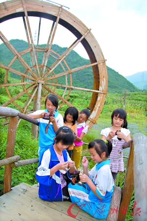 幾名瑤族少女,圍坐在緩緩轉動著的巨大水車旁,幾雙巧手飛針走線,一絲彩線靈活地在粗糙的織布上下穿刺,一個精美的吉祥圖案漸漸躍然布上。孩子們使用的刺繡技法,和中國幾乎所有刺繡方式都不同,那是在大山深處流傳有千年之久的神秘“過山瑤反面刺繡”。為了讓這一瀕臨失傳的古老藝術奇葩能夠后繼有人,乳源瑤族自治縣目前正在該縣專門接收少數民族學生就讀的學校中展開一場大規模的普及傳統民間技藝的教育。至上月止,累計4000多名瑤族少女掌握了“反面繡”的基本技法,其中佼佼者的作品,還作為珍貴禮品贈送給外賓。