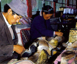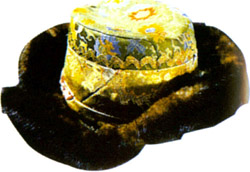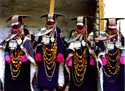 西邊的阿里普蘭地區盛行羔皮袍,制做精細、裝飾典雅。羔皮袍的面料以毛呢為主,領、袖、襟底鑲水獺皮,外套綢緞,這在整個藏區都是較具特色的。而普蘭服裝的最精美、最獨特的卻是婦女的“孔雀”服飾,它與阿里孔雀河的美名緊緊聯系在一起。孔雀河源頭似孔雀,它是美麗和吉祥的象征,為了使孔雀般的美麗和吉祥永生永世地存在于這塊土地上,婦女們的裝飾便模仿孔雀而流俗于今。婦女戴的帽子叫“町瑪”,是棕藍色彩線氆氌制做的圓筒帽,帽的底邊截一段為留辮子處,婦女的耳墜以珊瑚及珍珠連串而成,長約15厘米。獨特的帽子及耳墜象征孔雀的頭冠,婦女背部系“改巴”,即背部圍裙,“改巴”用毛色純白光滑的山羊皮制作,正中部鑲嵌帶有圓形花紋的棕藍色氆氌,是婀娜多姿孔雀的翅膀,底部開的三道叉口便是孔雀的尾羽。有的“改巴”皮面夾有色彩絢麗的綢緞,更具有非凡的風姿,猶如開屏孔雀臨現眼前,美麗多姿。