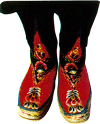 東南地區的工布服裝最典型的特征是男女皆穿“谷休”,即寬無袖袍。男子的“谷休”從腰部束扎,下擺不過膝,女裝“谷休”卻下垂至腳面。“谷休”大多是用氆氌制做的,也有用毛皮做的。工布男子都戴帽,特別喜歡戴一種從山南桑昂曲林傳去的用彩緞作裝飾的桑林帽。工布人的靴子也很講究,有“那刀”、“日局”兩種,男女均穿。“那刀”分上、中、下三等,“日局”靴是節日盛典才穿的。