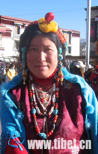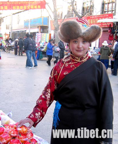 拉薩女性服飾則勾畫出另一道美麗的圖景。在冬日里,因為天氣寒冷,她們身穿用深色綢緞、氆氌制成的無袖長袍,外加時尚外衣,里襯各種花色綢衫,腰帶緊束,婀娜的身段獨具風韻。盛裝的拉薩女性耳帶金銀鑲綠松石的精美耳墜或耳環,而首飾、戒指則因個人喜好戴精巧的金、銀飾品以及晶瑩剔透的鉆石飾品。傳統的許多飾品裝束,則更多的在藏戲和歌劇舞臺上才能看到。如今,拉薩女性,尤其是年輕的女性,無論服裝,還是裝飾品,均更多的是追求簡便、適用、美觀,以及更能顯示身體線條和審美情趣,她們的穿著在傳統服飾的基礎上,正展現著多種新款式,在繼承和發展傳統服飾文化,保留古老原始文化痕跡的同時吸納外來異國異地的優秀服飾文化與時尚因素,表現出獨特、和諧、朝氣蓬勃的時代特色。
