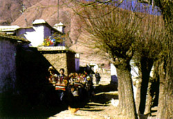 藏歷元月,是節日最多也最隆重的月份,在這個月里,幾乎天天都在過節。新年是人們最看重的節日,是一年中最隆重的節日。拉薩地區的人們,從藏歷的十二月份就開始做過新年的準備。從十二月中旬開始,每家每戶都會炸“卡賽”——一種用酥油和面粉制作的油果子。油果子的形象千奇百怪。同時,每家還要準備一個叫“切瑪”的木制彩色五谷斗,裝滿糌粑、麥粒、蠶豆、人參果等,上面還要插上青稞穗、雞冠花、日月牌等,并點綴上小塊酥油。炸好的“卡賽” 和做好的“切瑪”當作供品放在神像面前。到了這個月的二十八九,家家戶戶會把屋中的神龕、家俱擦得干干凈。有些人家甚至不辭辛苦,將自己的院落粉飾一新。在打掃干凈的灶房正中墻上或門前空地上,還用糌粑粉涂上吉祥的圖案。到了二十九的晚上,家家戶戶團團圍坐吃一頓“面疙瘩宴”,藏語叫做“古突”。這些面疙瘩被包上了諸如石子、羊毛、木炭、辣椒等多種蘊含不同意義的東西,無論吃到哪種東西總會給家人帶來一陣歡笑。吃完面疙瘩,家家戶戶傾巢出動去舉行隆重的送鬼儀式,一時間,整個拉薩城出現了壯觀的場面:端著鬼食盆的人在前面奔跑,舉著火把的人在后面緊追,直到鬼食盆被摔爛在熊熊燃燒的青稞秸堆里。第二天,也就是新年的第一天,天還不亮,各家的主婦紛紛到河邊背回“吉祥水”,全家人享用“吉祥水”熬出的粥和其他早已準備好的食品,然后家人都穿戴一新,迎接黎明。初一這天一般是家人團聚的日子,人們早早起床,穿上新衣,首先祭拜神靈,然后手捧五谷斗和青稞酒互相拜年,說一些吉祥的祝詞,接下來開始喝頭天做好的熱青稞酒,吃麥片吐巴和酥油煮的人參果。年初二,親友開始互相拜年。初三,人們還蜂擁至東郊的寶瓶山和西郊的藥王山,煨桑,插經旗,掛彩幡,祈求山神和水神賜予幸福平安。整個節日期間,被歌舞籠罩、鞭炮喧染的拉薩城沉浸在歡樂、祥和和喜慶的氣氛中。