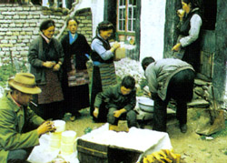 每年7、8、9月,西藏高原草肥水美,氣候宜人,正值膘肥體壯的母畜產(chǎn)奶的旺季,是提煉量多質(zhì)佳酥油的絕好時機(jī)。在那遼闊無垠的草原上,燦爛的陽光灑滿了牧場,肥壯的牛羊悠閑自得地啃食著青草,遠(yuǎn)遠(yuǎn)望去,似珍珠瑪瑙,星羅棋布;似片片云朵,飄來蕩去。好一派安謐、寧靜的高原風(fēng)光,令人心曠神怡。此時婦女們正在家里、帳篷周圍,從事提煉酥油等奶制品的勞動。
