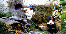 炒青稞前要做兩方面的準備工作,一是將沙子炒燙——將適量的沙子攤開在炒鍋內以旺火加熱;二是把青稞過一下水——把青稞倒入陶罐內并加水,片刻后,將陶罐底部出水嘴兒中的填塞物掏出,放掉水。這樣既達到了對青稞稍加清洗的目的,又使炒出的青稞能膨脹開來,并有酥脆的效果。