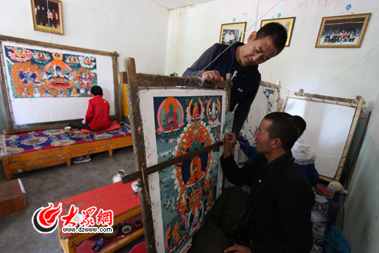 學習唐卡,至少要苦修八年,每天就這樣盤腿打坐,比繡花還要精細百倍