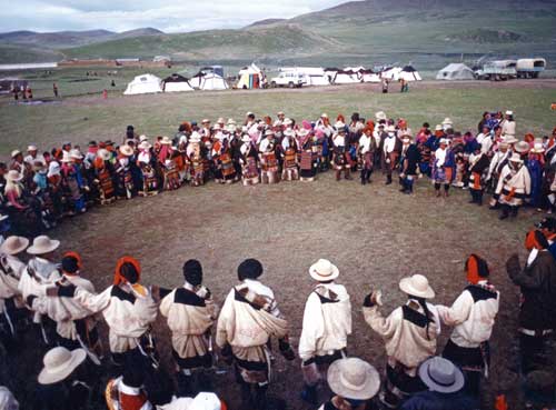 而山南地區(qū)《果諧》的形式,卻是先由各站半圈的男女在輪流歌唱,沿逆時針方向行走到歌唱結(jié)束,才在領(lǐng)舞者“諧本”發(fā)出的“休休休休!”或“次次次!”的叫聲后開始舞蹈。舞蹈一經(jīng)開始,就只見男女舞者分別以極快的節(jié)奏輪流跳著一段段舞蹈,似乎是在進行男女舞隊之間舞蹈速度的比賽,令人緊張而興奮。直到這種熱烈的快速舞蹈進行數(shù)遍后,領(lǐng)舞者在眾人舞蹈的同時,加入一段快速而幽默的“說唱詞”后,大家才在一同發(fā)出歡樂而激動的“休休休休!”叫聲中結(jié)束舞蹈。