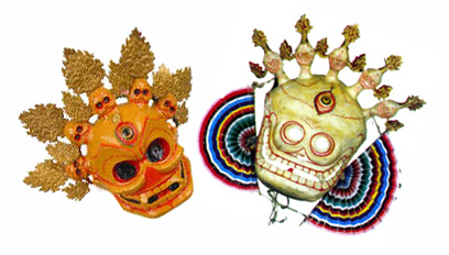 西藏面具工藝品除了吸收外來文化外,主要是受到西藏本土的原始宗教一苯教文化的直接影響。由于久遠的苯教信仰在吐蕃先民心中有著根深蒂固的地位,因而佛教和苯教在相當長的時間內(nèi)處子并駕齊驅(qū)的局面,結(jié)果兩種文化既相互競爭又相互融合。盡管最后佛教戰(zhàn)勝苯教而形成既不同于印度佛教,又不同于中原佛教的獨特宗教,人們稱“藏傳佛教”或“喇嘛教”。印度高僧蓮花生大師用佛法神威降服苯教神祗時,為了在民眾中贏得廣泛的信徒,同時將苯教中的巫術、妖法、火祭、梵魔等儀式連同鬼怪精靈一起帶入“佛門”。苯教中的山神、年神、龍神等“世間神”,以日贊(山妖)、奪錐(骷髏)、帕姆(女鬼)、貼龍(獨腳鬼)等等,這些土生土長的紙鬼率,也理直氣壯的進入佛教護法的行列,成為西藏面具制作的一個重要組成部分。